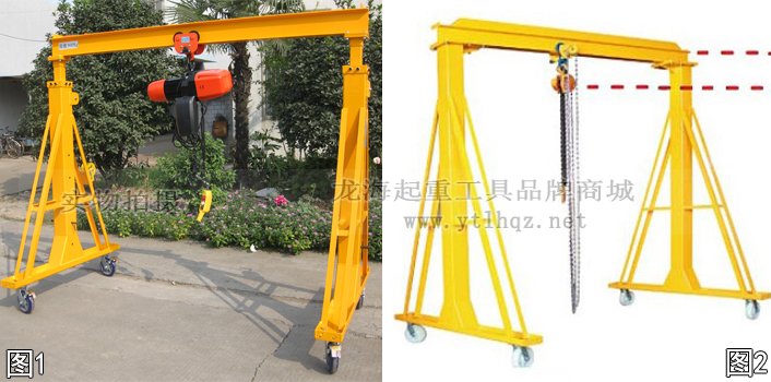 圖2、移動式龍門吊架:載荷500kg~2000kg,立柱頂部有斜撐結構,門架高度不能調節;