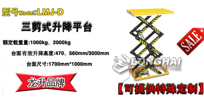 【產(chǎn)品名稱】三剪式電動(dòng)升降平臺(tái) 【產(chǎn)品品牌】龍升品牌 【產(chǎn)品規(guī)格】1T | 2T 【產(chǎn)品保質(zhì)】保質(zhì)期12個(gè)月 【是否現(xiàn)貨】現(xiàn)貨供應(yīng) 【產(chǎn)品分類】電動(dòng)升降平臺(tái) 【典型應(yīng)用】廣泛應(yīng)用于機(jī)械工廠、化工、倉儲(chǔ)、設(shè)備制造、維修等行業(yè)