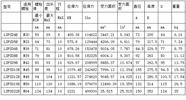 ●此款LSPSD型液壓螺栓拉伸器重量輕,結構緊湊,適合狹小空間使用; ●風電液壓螺栓拉伸器采用特殊鋼制作,表面經過防銹處理,耐腐蝕; ●LSPSD型液壓螺栓拉伸器雙級缸設計,增加拉伸長度; ●液壓螺栓拉伸器彈簧自動回位,適合頻繁使用; ●風電液壓螺栓拉伸器的額定工作壓力150MPa,可配高壓手動泵、高壓氣動泵和高壓電動泵工作。