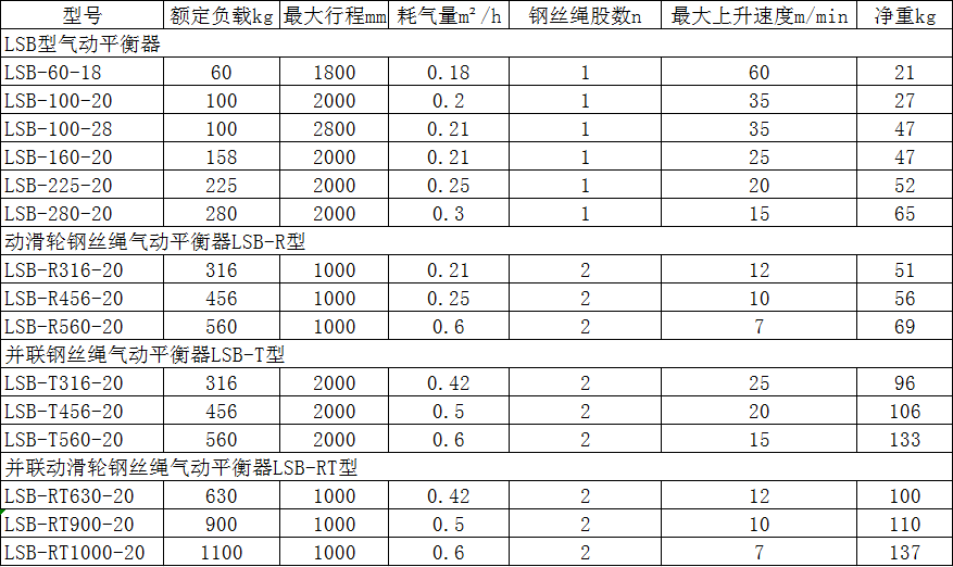 LSB型氣動(dòng)平衡器優(yōu)勢: ●LSB型氣動(dòng)平衡器可24小時(shí)不間斷運(yùn)行 ●LSB型氣動(dòng)平衡器采用壓縮空氣為動(dòng)力,無火花運(yùn)行 ●LSB型氣動(dòng)平衡器運(yùn)行速度快,是電動(dòng)葫蘆的2-6倍 ●LSB型氣動(dòng)平衡器有斷氣保護(hù),過載保護(hù)功能,使用更安全 ●LSB型氣動(dòng)平衡器具有無級變速功能,可根據(jù)吊起重量自由控制上升速度 ●LSB型氣動(dòng)平衡器具有自使用的“漂浮”功能,當(dāng)零部件被吊起時(shí)處于“無重力"狀態(tài),輕松實(shí)現(xiàn)精準(zhǔn)定位,實(shí)現(xiàn)助力裝配。 ●LSB型氣動(dòng)平衡器耗氣量極低,平均每個(gè)工作循環(huán)耗氣量約為0.21m/h,是氣動(dòng)葫蘆耗氣量的1/50,體積小,無噪音 ●LSB型氣動(dòng)平衡器單繩60-280kg,速度較快,懸浮距離400mm ●LSB型氣動(dòng)平衡器并聯(lián)316-560kg,雙機(jī)并聯(lián)承載力大一倍,行程不變 懸浮距離不變 ●LSB型氣動(dòng)平衡器動(dòng)滑輪316-560kg,單機(jī)雙繩承載力大一倍,行程縮小一倍,懸浮距離200mm ●LSB型氣動(dòng)平衡器動(dòng)滑輪并聯(lián)630-1100kg,雙機(jī)四繩,承載力大兩倍,行程縮小一倍,懸浮距離200mm,適合重型設(shè)備及工件搬運(yùn)安裝作業(yè) LSB型氣動(dòng)平衡器實(shí)物:
